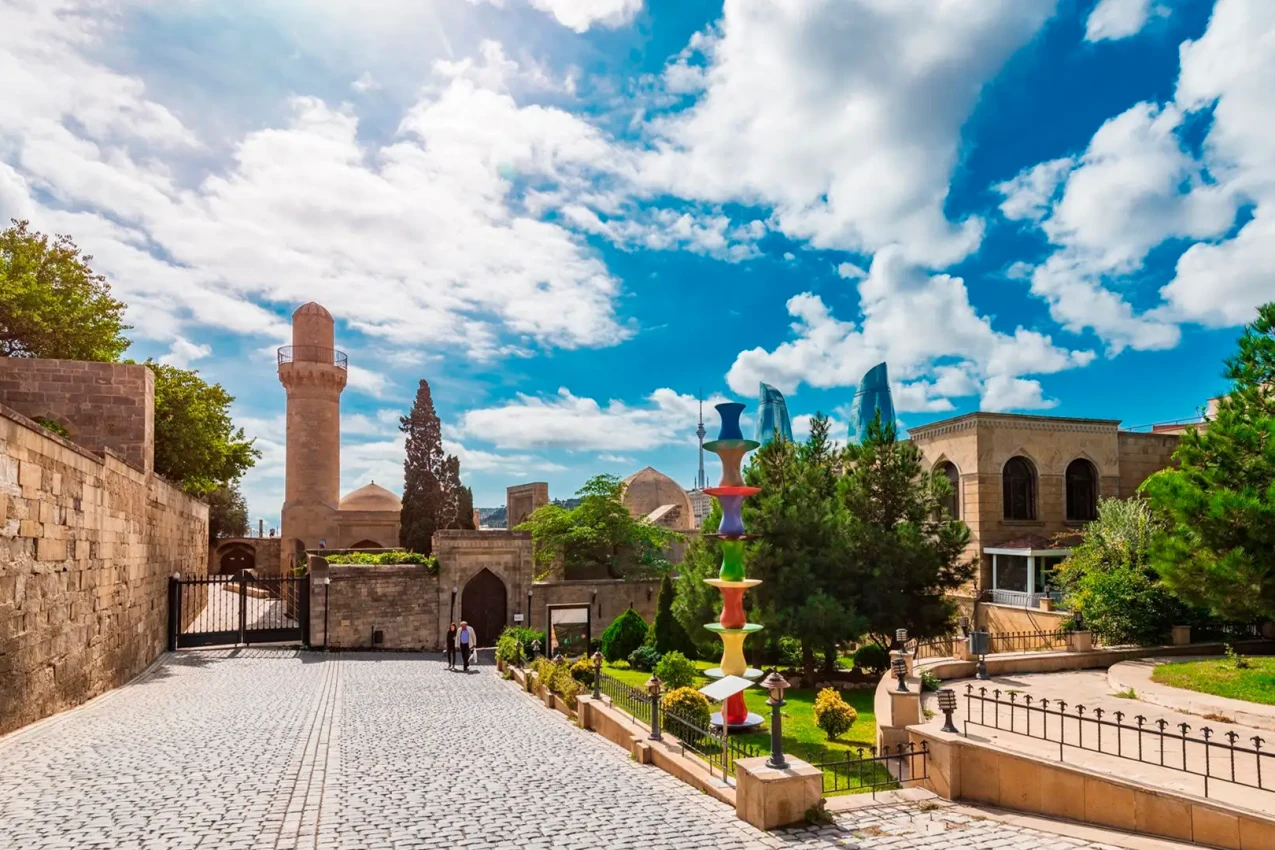 Baku (Azerbaijão): Cidade murada histórica contrastando com arquitetura contemporânea à beira do Mar Cáspio.